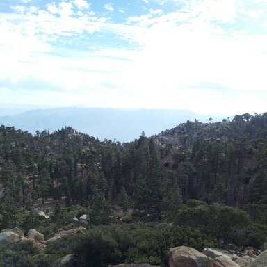 know what my return route would look like. It was disappointing that my great adventure had been pared down to two more hours but I was really enjoying being in the trees on top of the world. Heading towards Martinez Mtn (I made it about halfway) was a mix of big pines and low Manzanita until about 6,000 ft where the brush got thicker. I dropped into Horsetheif Canyon and meandered down until it pinched into some large, beautiful (but stagnant) rockbowl pools that I could not downclimb. It was nearing 2:00 so I climbed a ridge to the south and came across some segments of trail leading up west and then south into Black Rabbit Canyon. It was clear that the trail was there long before the bushes and that progress would be very slow and painful from then on.